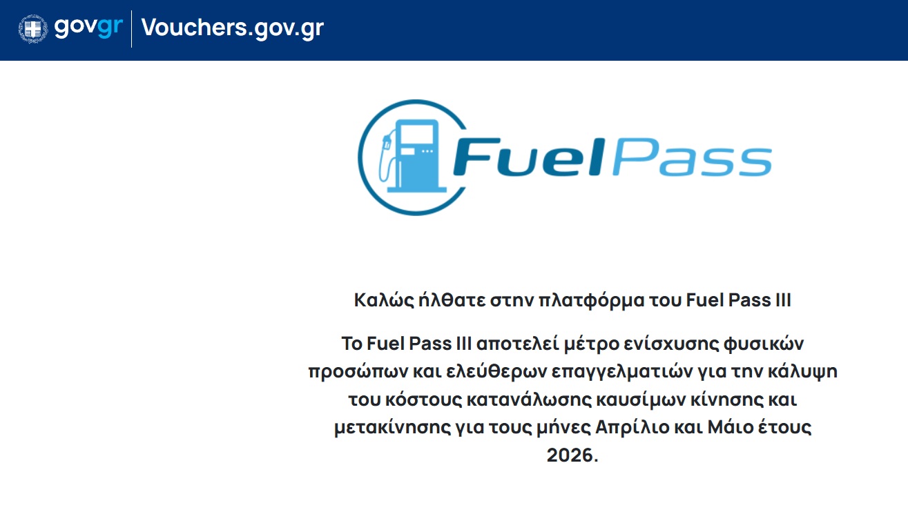 Μέσω του vouchers.gov.gr μπορούν να υποβάλουν από σήμερα, 6 Απριλίου, οι δικαιούχοι την αίτησή τους για την επιδότηση καυσίμων μέσω του Fuel Pass. Η πρωτοβουλία εντάσσεται στο πλαίσιο των μέτρων, που ανακοίνωσε η Κυβέρνηση, για τη στήριξη πολιτών από την αύξηση του ενεργειακού κόστους, απόρροια του πολέμου στη Μέση Ανατολή και πραγματοποιείται στο πλαίσιο