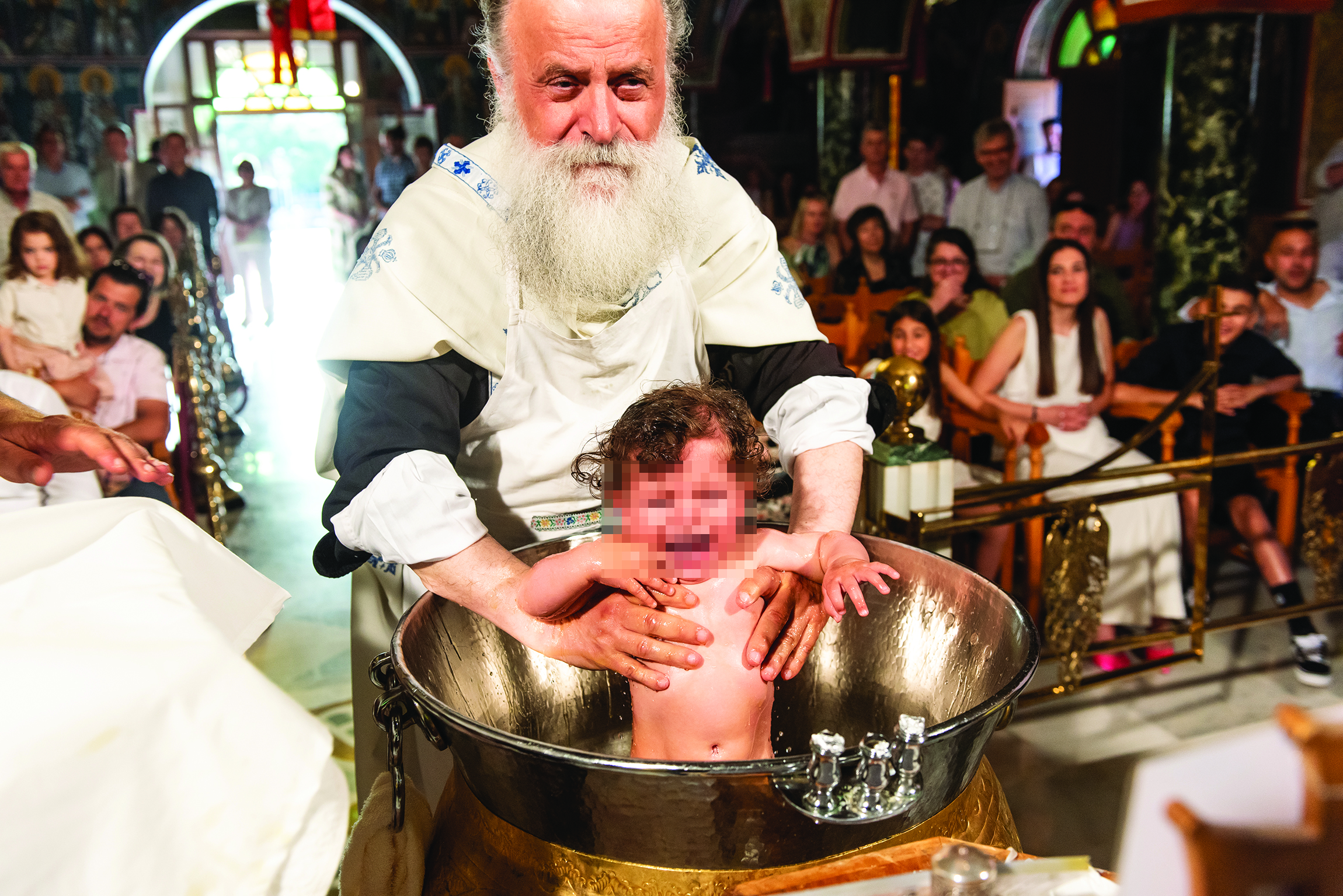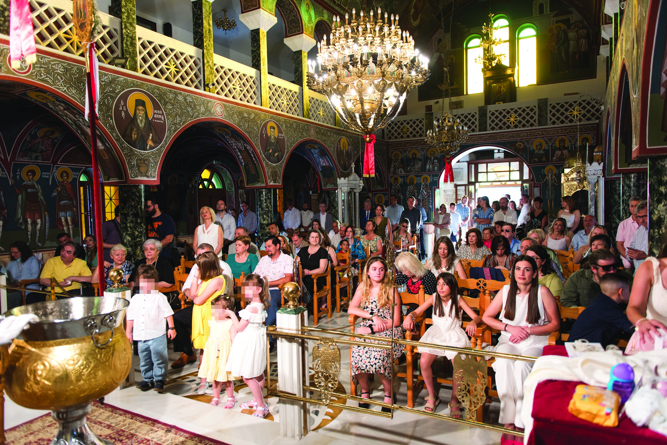 Ο π. Γεώργιος Φειδόπουλος μόλις το ρολόι έδειξε 7 ακριβώς ξεκίνησε το μυστήριο της βάπτισης σε κατανυχτική ατμόσφαιρα καθώς η ημέρα χαρακτηρίστηκε από τις διακοπές ρεύματος στην περιοχή, που επηρέασαν και τον Ιερό Ναό. Η μικρούλα καθόταν υπομονετικά στην αγκαλιά του νονού της, ξαφνιασμένη όμως και όλο περιέργεια για το τι συμβαίνει γύρω της και έχει περιτριγυριστεί από κόσμο.