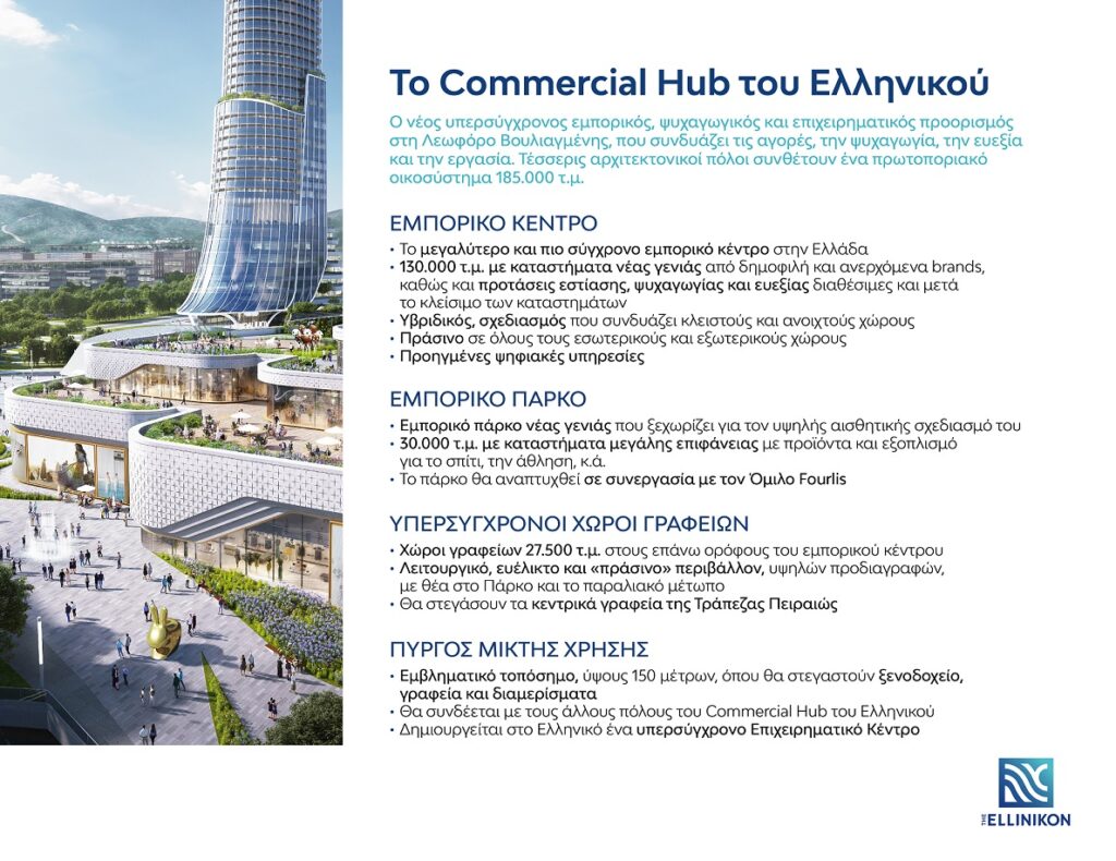 Το Commercial Hub του Ελληνικού, τον νέο υπερσύγχρονο εμπορικό, ψυχαγωγικό και επιχειρηματικό προορισμό που θα εκτείνεται σε περισσότερα από 185.000τ.μ. επί της Λεωφόρου Βουλιαγμένης, παρουσίασε την Τρίτη 7 Δεκεμβρίου η Lamda Development. Στο Commercial Hub θα βρίσκεται το μεγαλύτερο εμπορικό κέντρο στην Ελλάδα, ένα εμπορικό πάρκο επόμενης γενιάς με καταστήματα μεγάλης επιφάνειας, καθώς και υπερσύγχρονοι χώροι γραφείων. Δίπλα ακριβώς, θα αναπτυχθεί ένας εμβληματικός πύργος μικτής χρήσης, όπου θα στεγαστούν ξενοδοχείο, γραφεία και διαμερίσματα. Πρόκειται για ένα πρωτοποριακό οικοσύστημα, το οποίο εισάγει μία νέα φιλοσοφία στις αγορές, στη διασκέδαση, στην εργασία, στην καθημερινότητα των πολιτών.