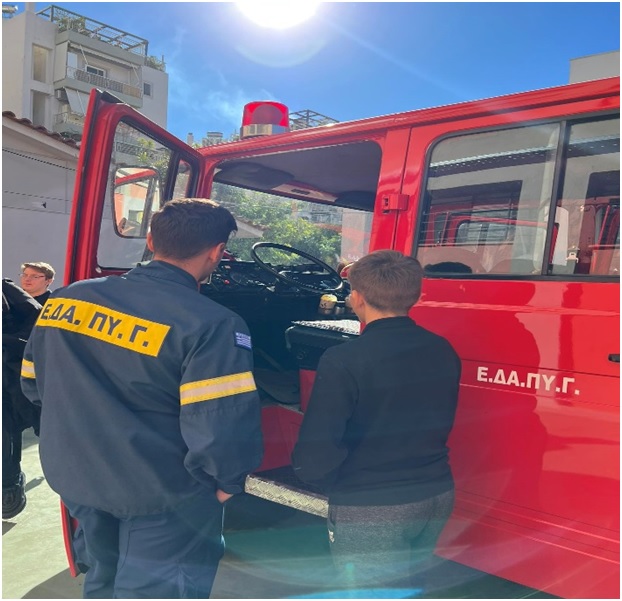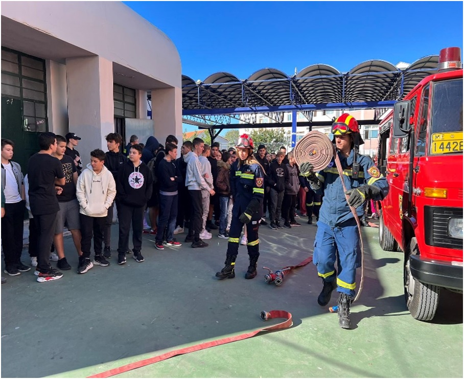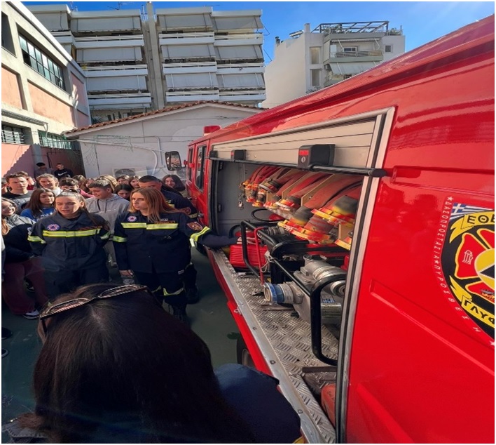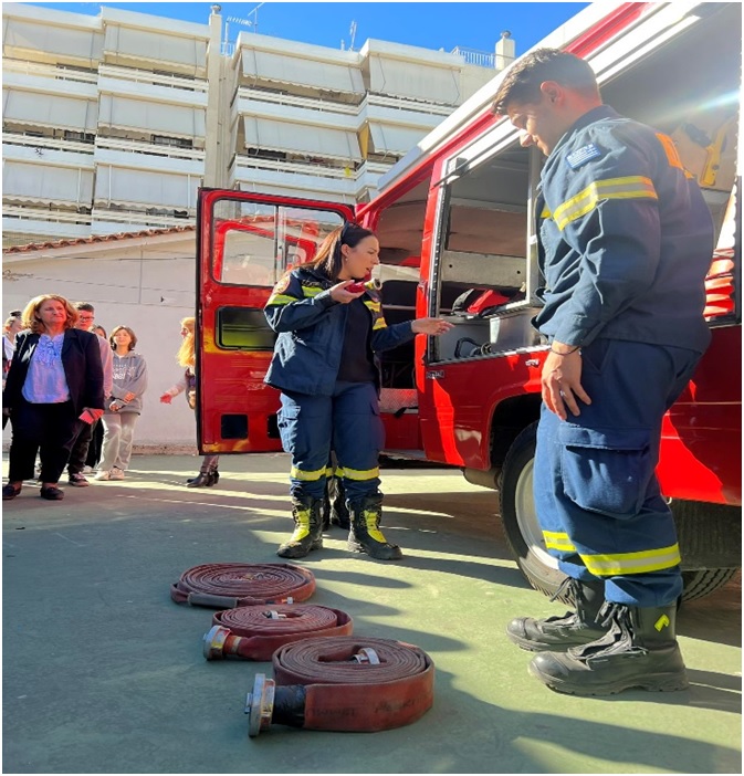 7. Πρακτική επίδειξη κατάσβεσης πυρκαγιάς από το δεκαμελές εθελοντικό επιτελείο της Ε.ΔΑ.ΠΥ.Γ. με το πυροσβεστικό τους όχημα στον προαύλιο χώρο της σχολικής εγκατάστασης.