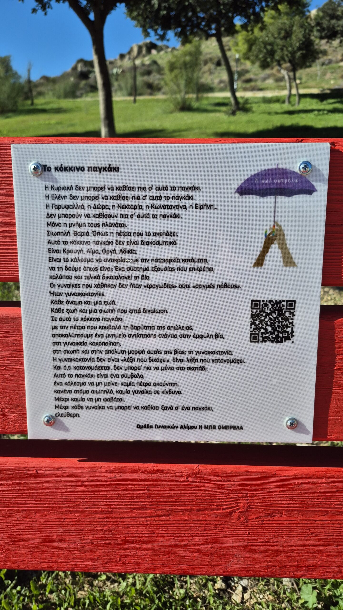 Τέσσερα παγκάκια βάφτηκαν σε έντονο κόκκινο χρώμα σε κεντρικά και συμβολικά σημεία του Αλίμου, στο πλαίσιο δράσης της «Μωβ Ομπρέλας» με αφορμή τη Διεθνή Ημέρα για την Εξάλειψη της Βίας κατά των Γυναικών (25 Νοεμβρίου) και με στόχο τη διαρκή υπενθύμιση ενάντια στην έμφυλη βία και τις γυναικοκτονίες.