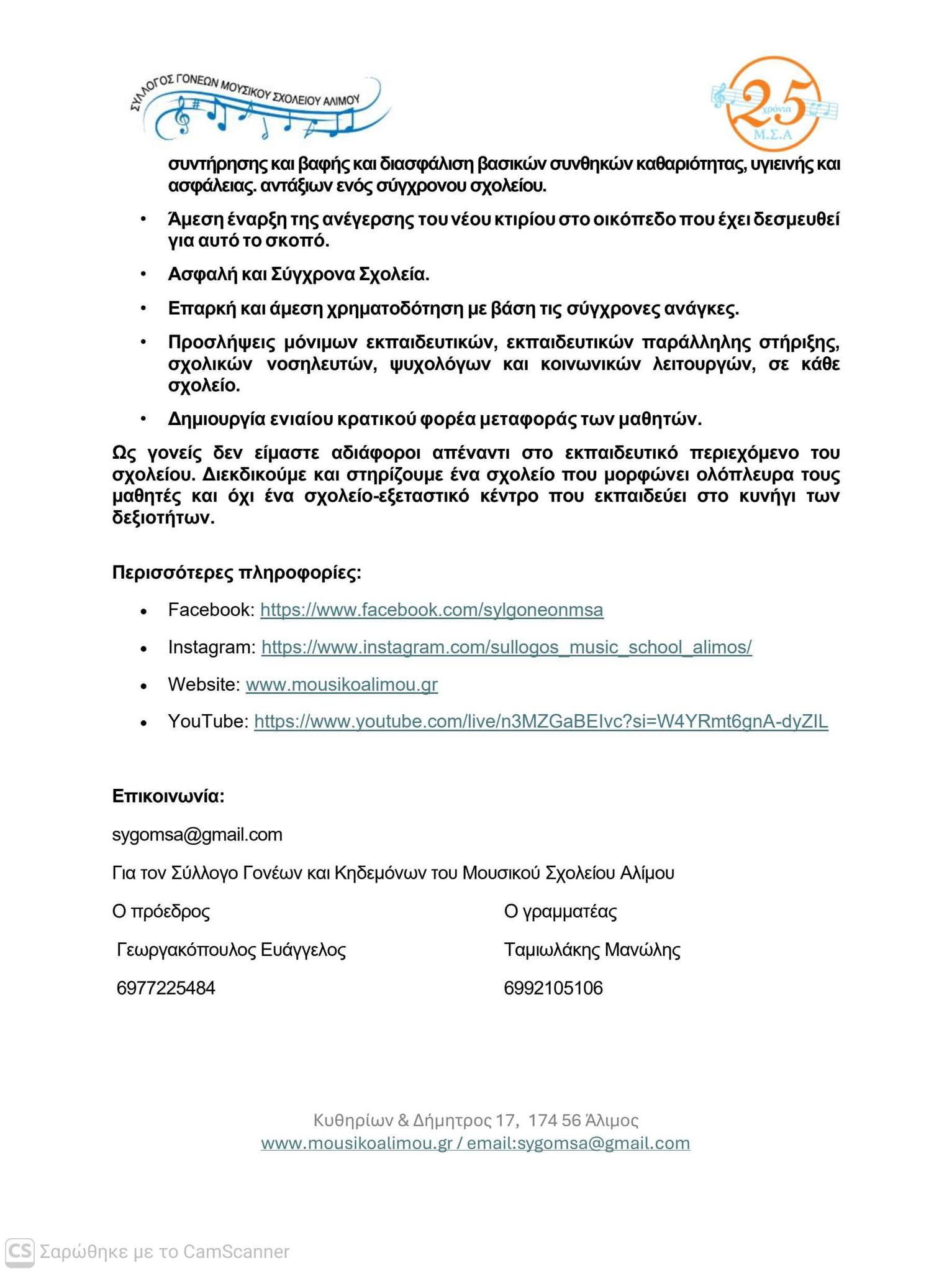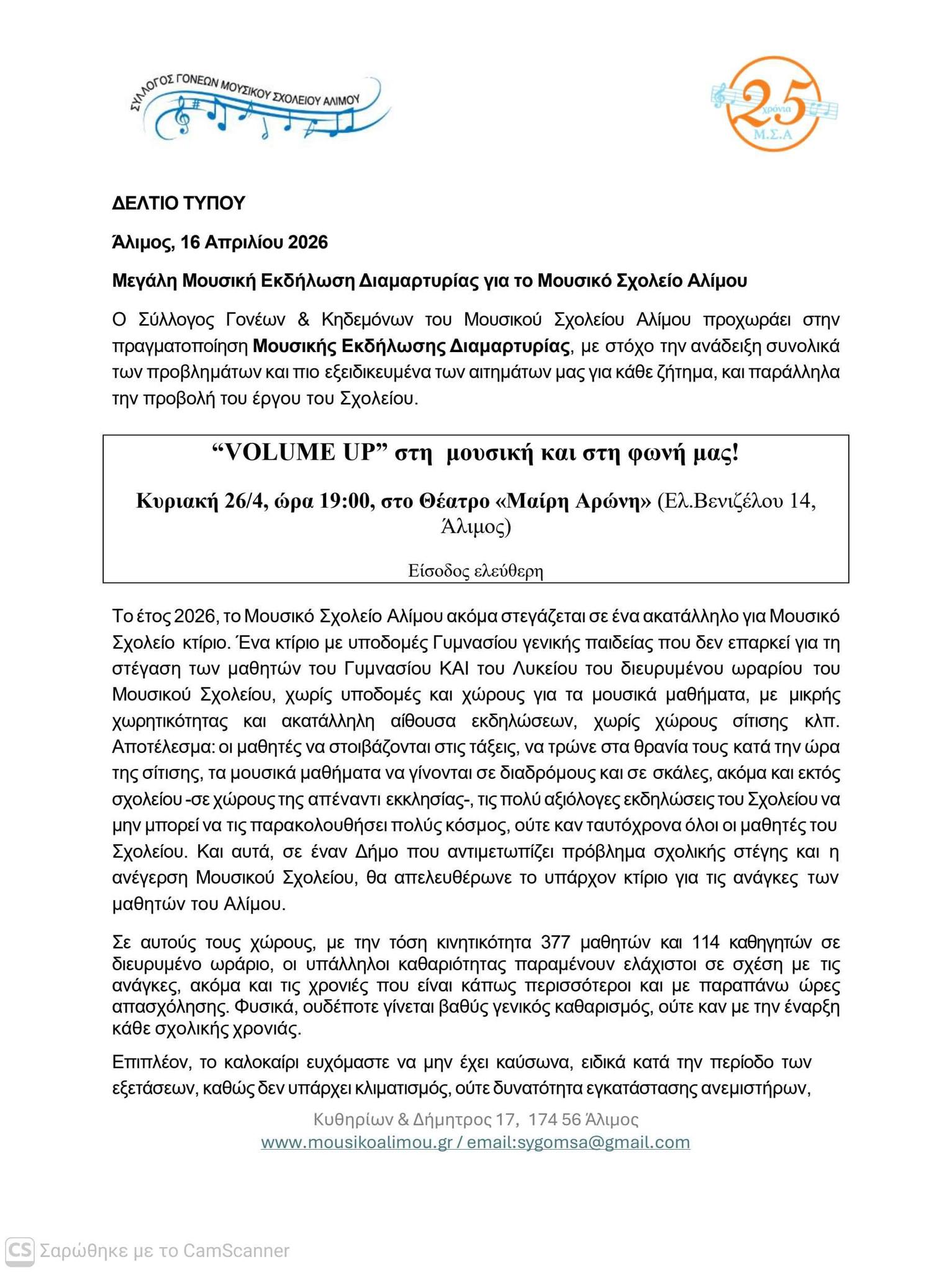 Σε μια ηχηρή κινητοποίηση προχωρά ο Σύλλογος Γονέων και Κηδεμόνων του Μουσικού Σχολείου Αλίμου, διοργανώνοντας μεγάλη μουσική εκδήλωση διαμαρτυρίας την Κυριακή 26 Απριλίου, στις 19:00, στο θέατρο «Μαίρη Αρώνη».