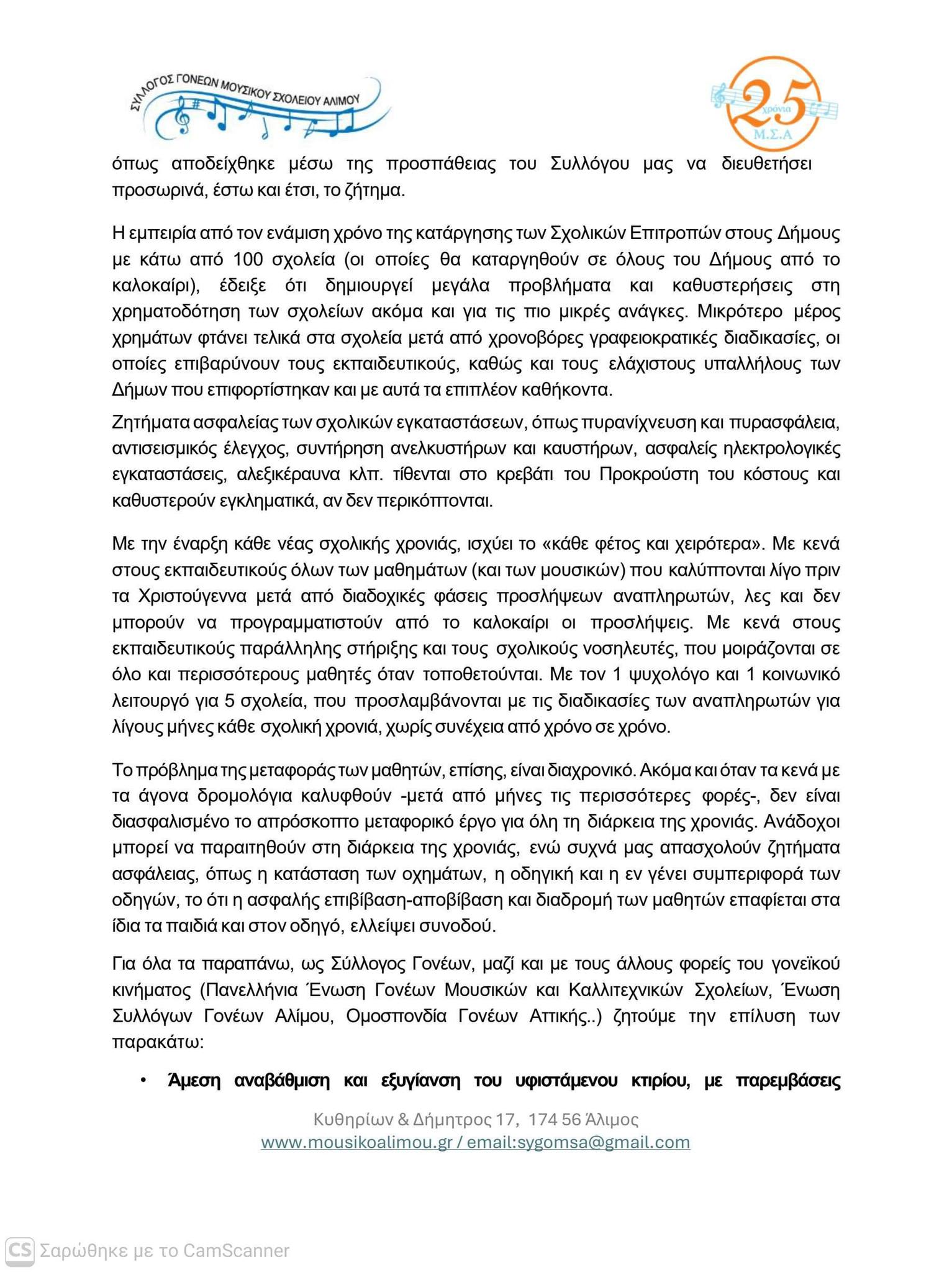 Για όλα τα παραπάνω, ως Σύλλογος Γονέων, μαζί και με τους άλλους φορείς του γονεϊκού κινήματος (Πανελλήνια Ένωση Γονέων Μουσικών και Καλλιτεχνικών Σχολείων, Ένωση Συλλόγων Γονέων Αλίμου, Ομοσπονδία Γονέων Αττικής…) ζητούμε την επίλυση των παρακάτω:
