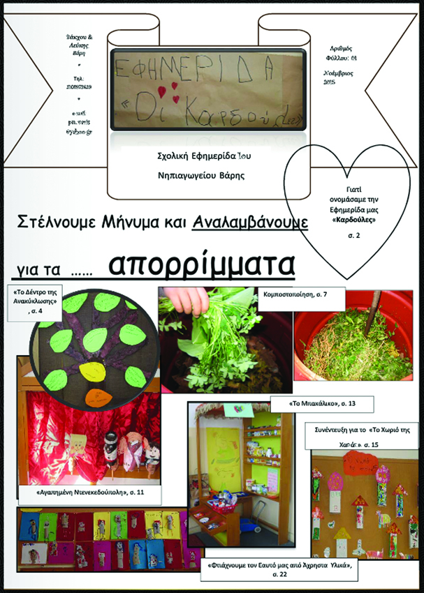 «Οι Καρδούλες» είναι το πρώτο εκδοτικό εγχείρημα για τους μικρούς ρεπόρτερ του 1ου Νηπιαγωγείου Βάρης. Έγχρωμο, 24 σελίδων με ποικίλη ύλη, περιλαμβάνει από δραστηριότητες και ζωγραφιές μέχρι και συνέντευξη (!), ένα πλούσιο περιεχόμενο φτιαγμένο αποκλειστικά από τα ίδια τα παιδιά με τη συνεργασία και καθοδήγηση των νηπιαγωγών τους κ.κ. Βασιλική Σκουρλή και Ιωάννα Αντιπάτη, δεν θα αφήσει ασυγκίνητο όποιον δραστηριοποιείται στο περιβάλλον του σχολείου και σύντομα θα αποκτήσει το δικό του φανατικό κοινό.