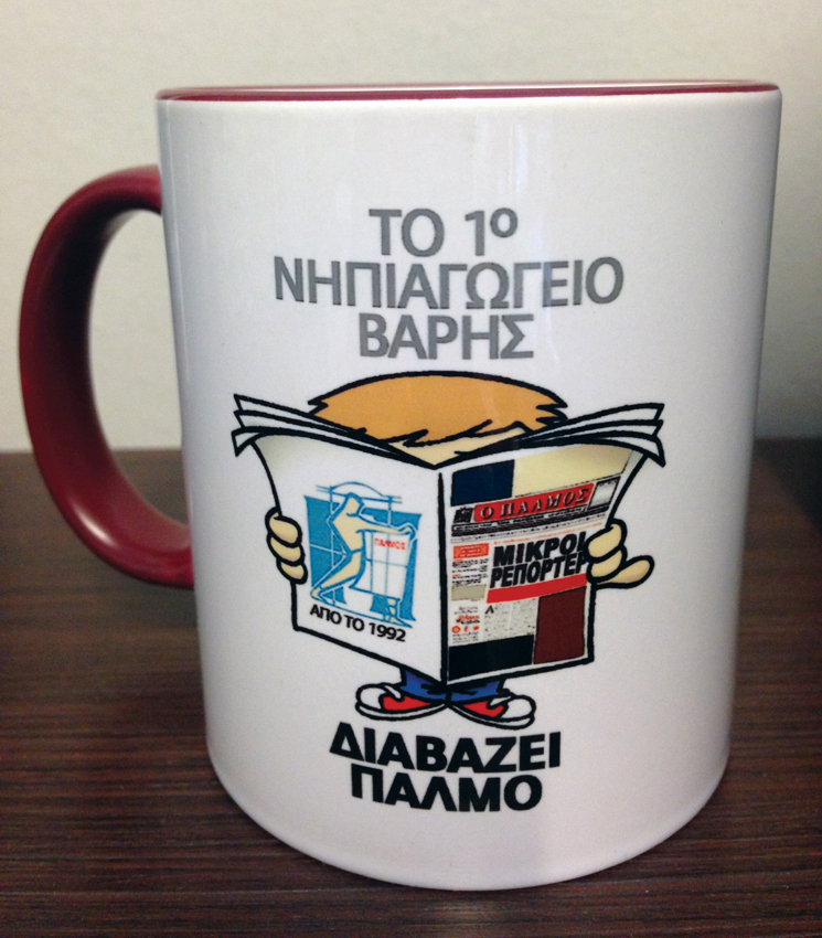 «Όποιος βάζει μπουφάν θα παραλαμβάνει και το δώρο του» ακούστηκε η φωνή της κ. Βίκυς που οργάνωνε τους μικρούς ρεπόρτερ. Ένα ένα, φορώντας το μπουφάν του πλησίαζε τον εκδότη του «Π», Παύλο Φιλιππόπουλο και παραλάμβανε το αναμνηστικό δώρο του. Μια σακούλα με εφημερίδες, έναν χυμό και μια κούπα που έγραφε «Το 1ο Νηπιαγωγείο Βάρης διαβάζει Παλμό».
