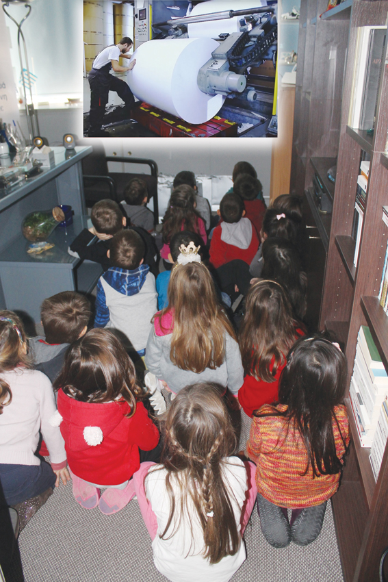 Η ώρα πέρασε πολύ γρήγορα και ευχάριστα. Χαμογελαστά παιδικά πρόσωπα, αγόρια και κορίτσια που διψούσαν για γνώση. Γνωριμίας τα πρώτα λεπτά της συνάντησης και διαπιστώσαμε πως κάθε παιδί είχε το δικό του ρόλο – θέση στην σχολική τους εφημερίδα. Δημοσιογράφοι, φωτογράφοι, σκιτσογράφοι, φωτορεπόρτερ, ένα ένα συστηνόταν με το όνομα και την ιδιότητα του. Στη συνέχεια άκουσαν με προσοχή τα όσα είπαμε για το έντυπο, για τη δομή του, για το πως γεμίζει κάθε εβδομάδα ένα λευκό χαρτί με κείμενο, εικόνες, σκίτσα… Της συζήτησης ακολούθησε ένα 10λεπτο βίντεο από το τυπογραφείο. Πως τα όσα με κόπο δημιουργήσαμε παίρνουν σάρκα και οστά; Πως πιάνουμε στα χέρια μας την εφημερίδα; Το βίντεο ήρθε να λύσει τις πρώτες απορίες, ενώ η ταχύτητα της εκτύπωσης άφησε στόματα ανοιχτά και που και που ακούγονταν επιφωνήματα.. «Η εφημερίδα κάνει βόλτα», είπε το πρώτο παιδί με ενθουσιασμό και συνέχισαν και τα επόμενα βλέποντας το πως η εφημερίδα κάνει τον κύκλο της από την εκτύπωση μέχρι τη βιβλιοδεσία και την διανομή.
