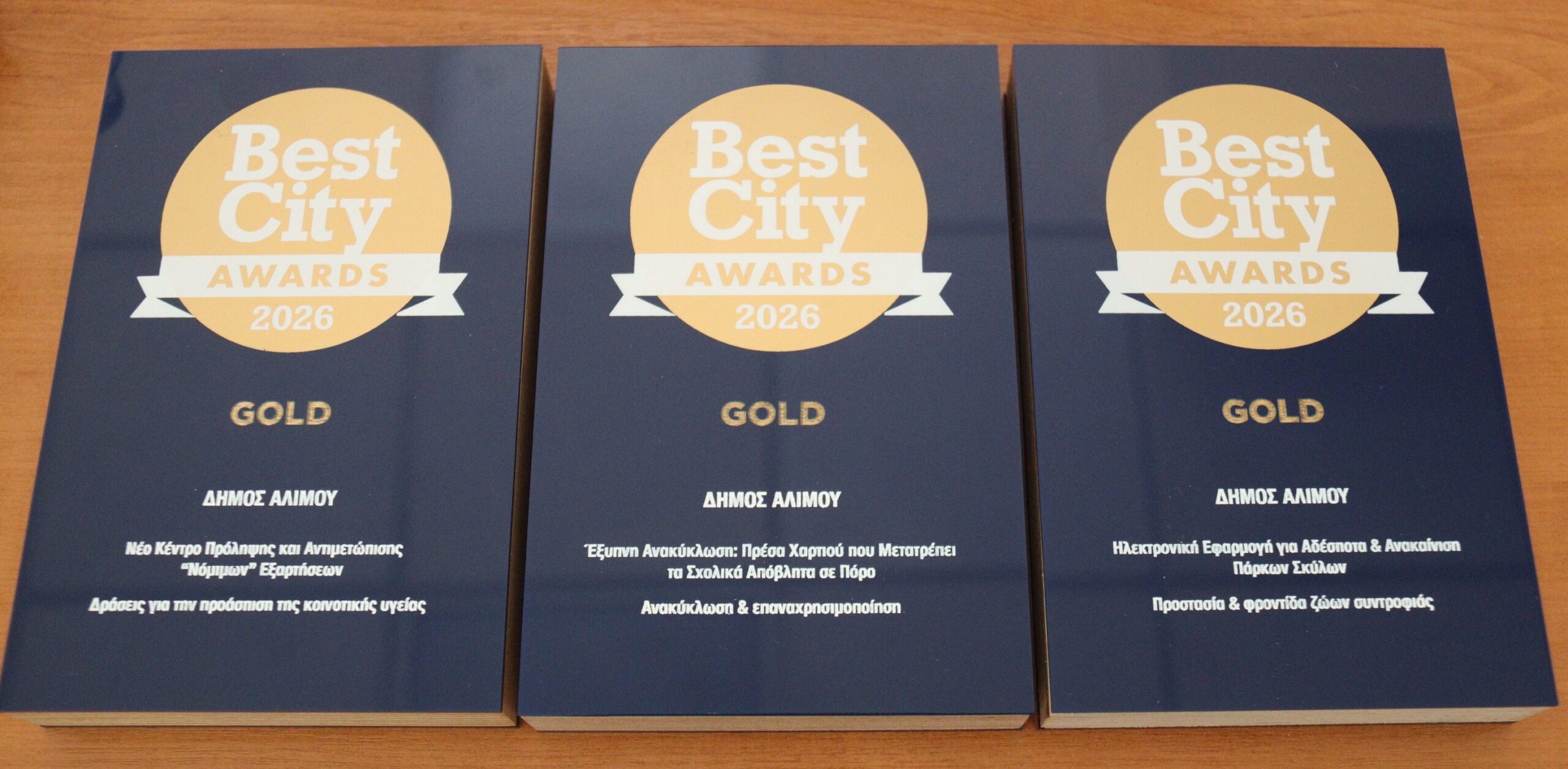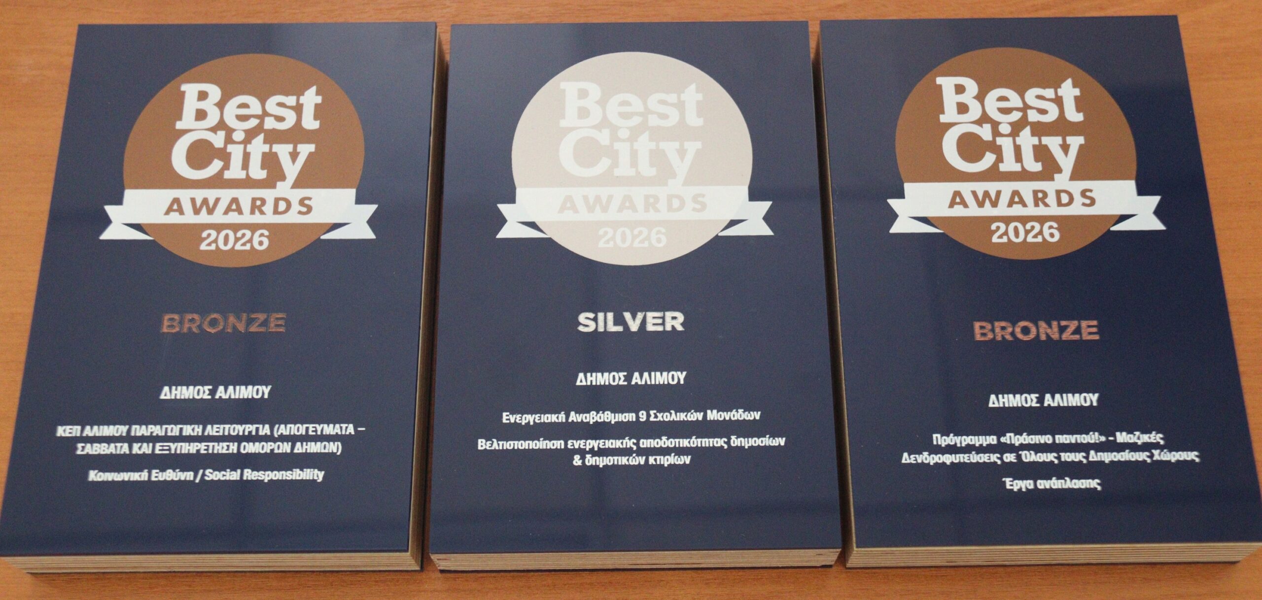 Έξι συνολικά Βραβεία (3 Χρυσά, 1 Ασημένιο, 2 Χάλκινα) απέσπασε ο Δήμος Αλίμου την Τετάρτη 11 Φεβρουαρίου 2026 κατά την τελετή «Best City Awards» στο «Σεράφειο» Δήμου Αθηναίων υπό την αιγίδα της Κεντρικής Ένωσης Δήμων Ελλάδας (ΚΕΔΕ).