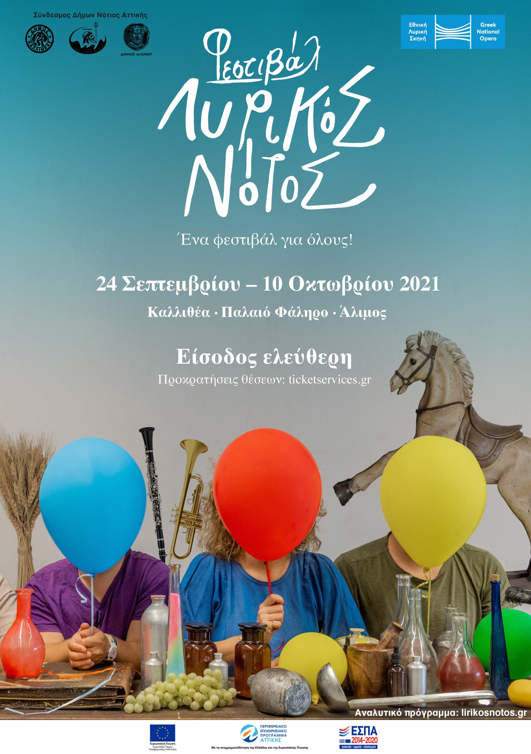 Από τις 24 Σεπτεμβρίου έως τις 10 Οκτωβρίου η Εθνική Λυρική Σκηνή και ο Σύνδεσμος Δήμων Νότιας Αττικής (Άλιμος, Καλλιθέα, Παλαιό Φάληρο) παρουσιάζουν τον «Λυρικό Νότο», ένα φεστιβάλ για όλους, με μουσικά παραμύθια, συναυλίες και ένα πολιτιστικό λεωφορείο γεμάτο εκπλήξεις. Το φεστιβάλ συγχρηματοδοτείται από την Ευρωπαϊκή Ένωση μέσω του Συνδέσμου Δήμων Νότιας Αττικής. Η είσοδος για το κοινό είναι ελεύθερη!