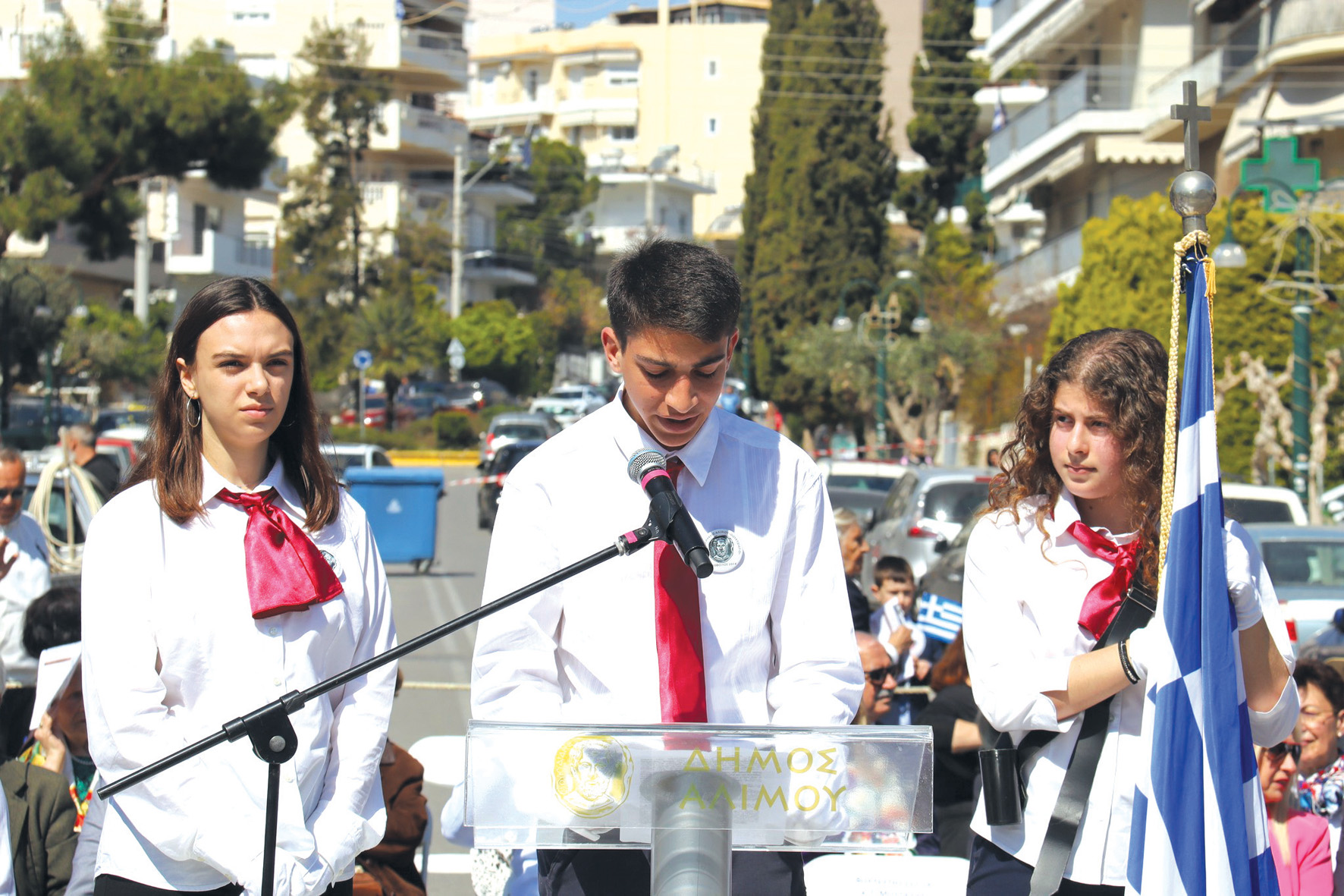 Με αυτά τα λόγια ξεκίνησαν τον πανηγυρικό της 25ης Μαρτίου 2023 στον Δήμο Αλίμου οι μαθητές του Θουκυδίδειου 1ου Λυκείου, Χριστίνα Κοκκαλιάρη, Αθανάσιος Μπουλάς και Αθηνά Πασκαλίδη.