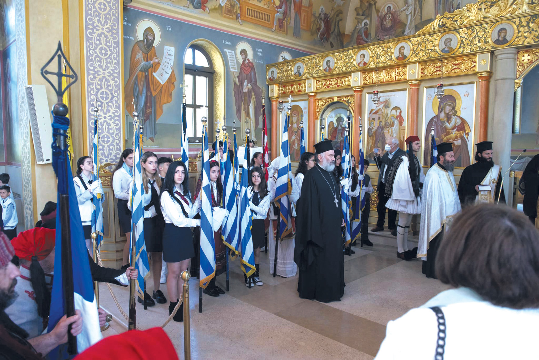Μετά την καθιερωμένη επίσημη δοξολογία στον Ιερό Ναό Κοιμήσεως της Θεοτόκου, πραγματοποιήθηκε η επιμνημόσυνη δέηση στο Μνημείο των Ηρώων στην Πλατεία Φλέμινγκ.