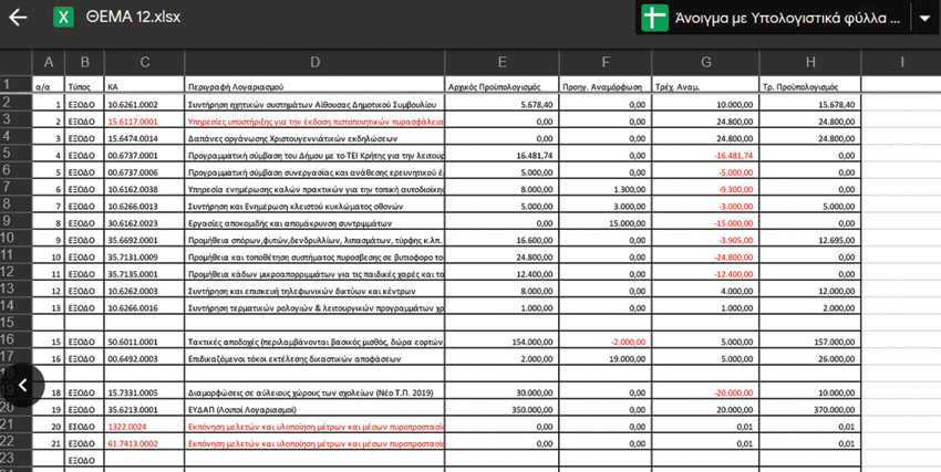 Στη συνέχεια ακολουθεί η συζήτηση της αναμόρφωσης στο δημοτικό συμβούλιο. Αρχικά η συνεδρίαση είχε προγραμματιστεί για τις 24/10, αλλά, λόγω της απεργίας των εργαζομένων, έγινε στις 29/10 και το 12ο θέμα του δημοτικού συμβούλιου είναι η αναμόρφωση του προϋπολογισμού. Στα εισηγητικά που λάβαμε 25/10 υπάρχει μία τροποποίηση αυτού που ψηφίστηκε στην οικονομική επιτροπή, οι λογαριασμοί πλέον έχουν γίνει 21 (υπάρχει σχετική εικόνα).