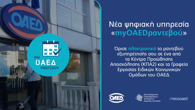 Τη δυνατότητα να προγραμματίζουν ψηφιακά τις επισκέψεις τους στις υπηρεσίες του ΟΑΕΔ έχουν οι πολίτες από το πρωί της Τρίτης. Πρόκειται για την νέα υπηρεσία «myOAEDραντεβού» και αφορά μόνον όσες