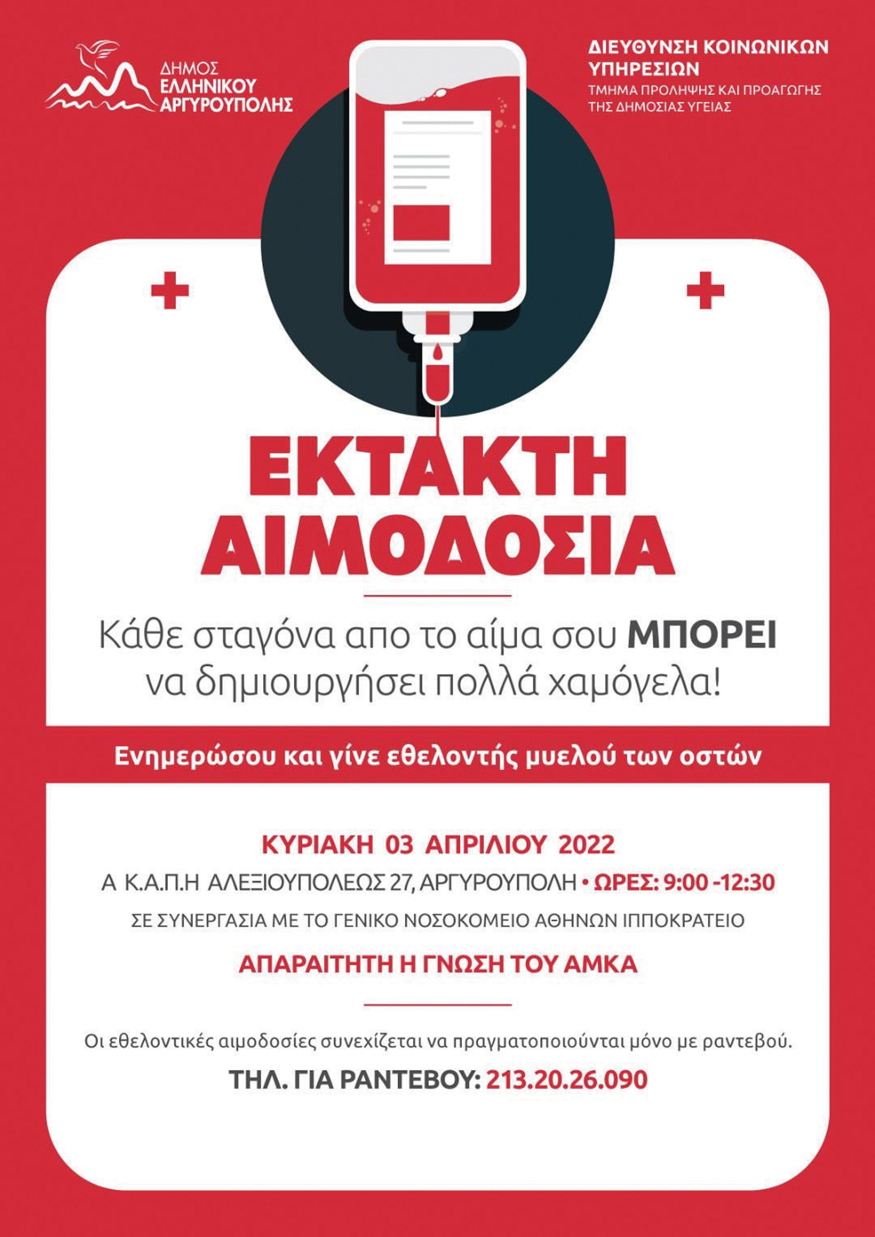 O Δήμος Ελληνικού-Αργυρούπολης ανακοινώνει τον προγραμματισμό μίας ακόμη έκτακτης αιμοδοσίας αφού η αιμοδοσία στις μέρες μας, είναι πιο απαραίτητη από ποτέ καθώς μία από τις συνέπειες της πανδημίας είναι και