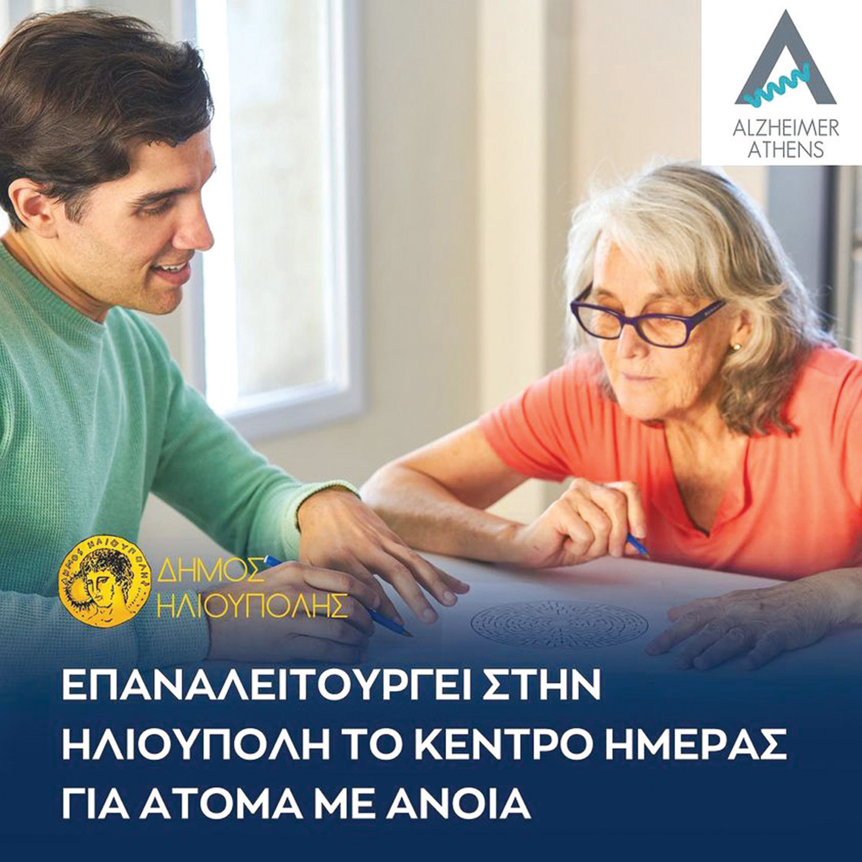 Η Κοινωνική Υπηρεσία του Δήμου Ηλιούπολης ανακοινώνει την επαναλειτουργία του Κέντρου Ημέρας για άτομα με άνοια, σε συνεργασία με την «Εταιρεία Alzheimer Αθηνών», για την δωρεάν παροχή υπηρεσιών προς δημότες